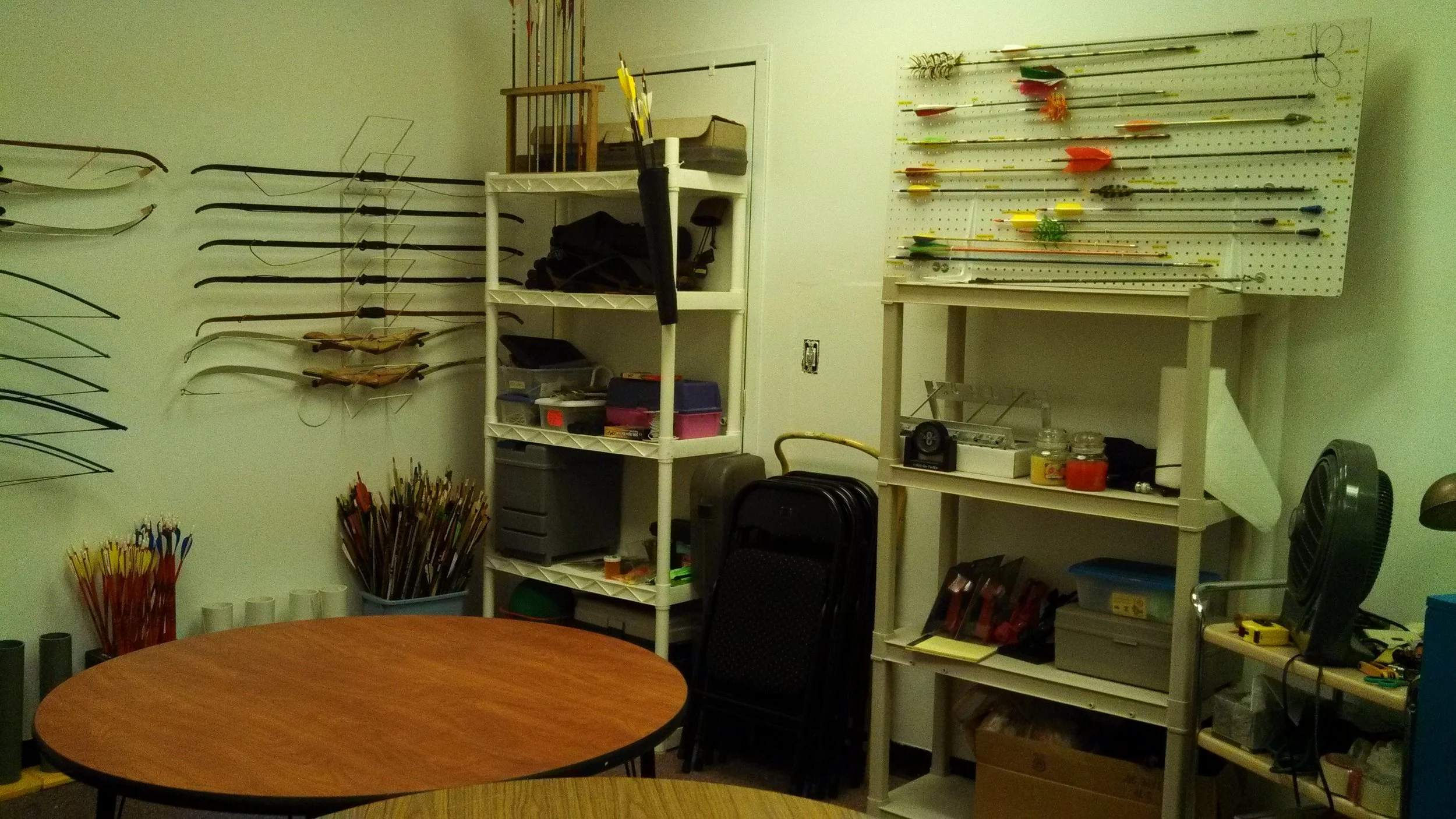 There are 12 target bales with a maximum shooting distance of 20 yards. Distances are marked on the floor at 20, 30, 40, 50, and 60 feet and at 18 meters. There is also a spectator-classroom area, a workshop and an office.